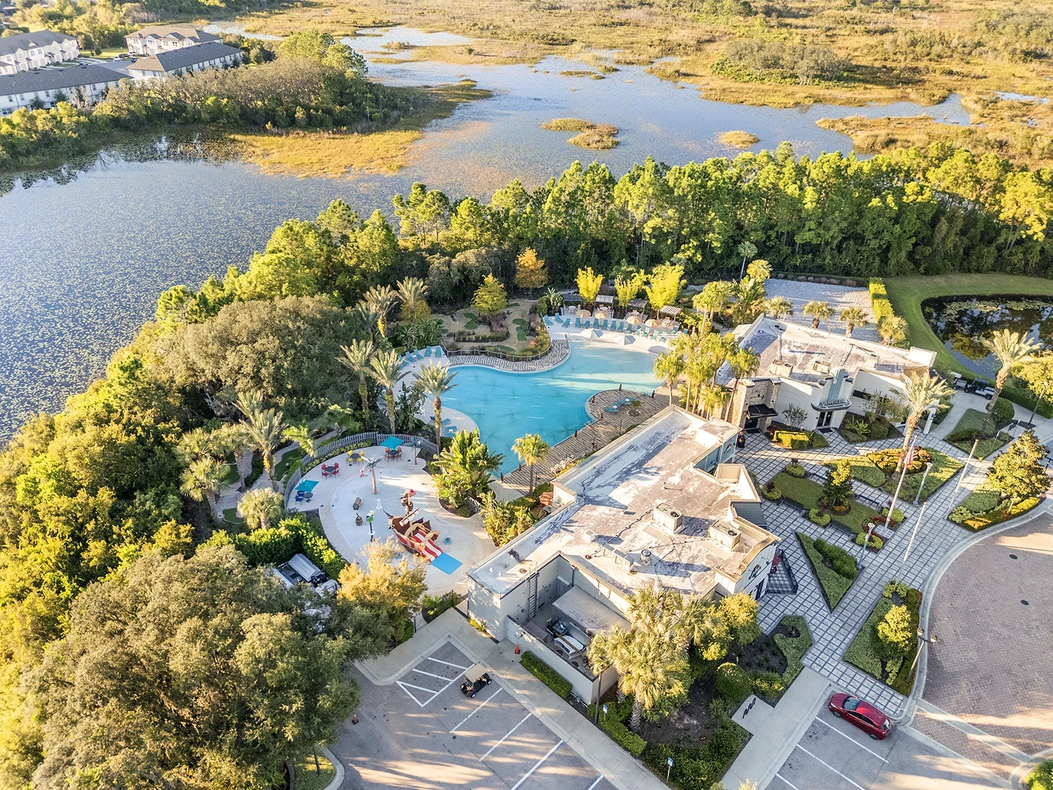Aerial view of the community’s resort-style pool and clubhouse surrounded by lush Florida nature.