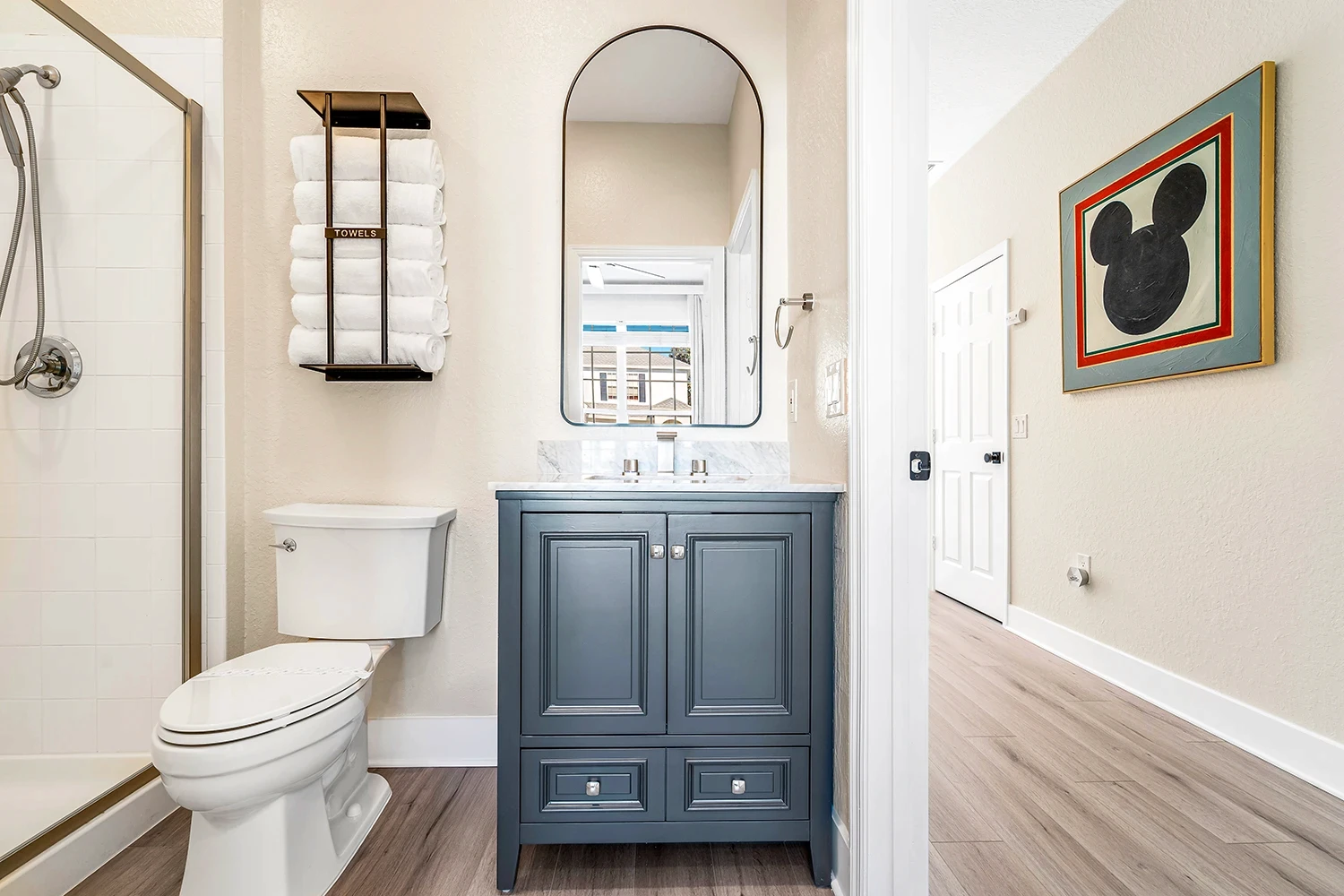 Updated ensuite bathroom featuring a navy vanity, marble countertop, and fresh hotel-style linens.