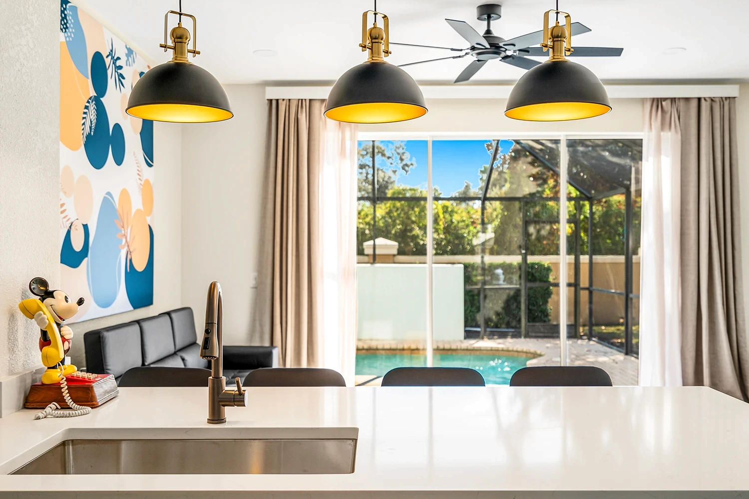 Modern kitchen island with matte-black pendants and a view of the screened-in pool.
