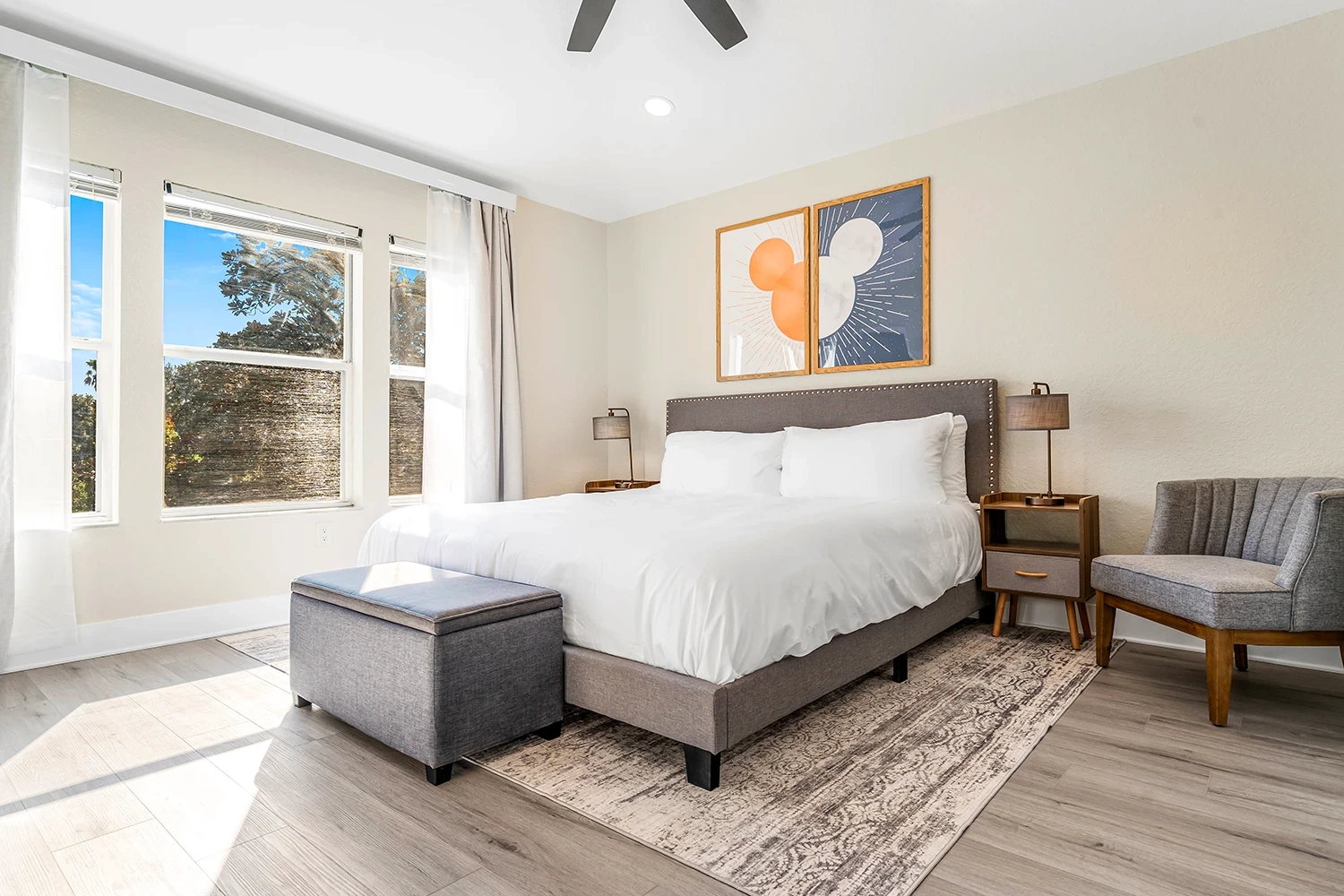 Spacious primary suite with abundant natural light and serene, modern décor.