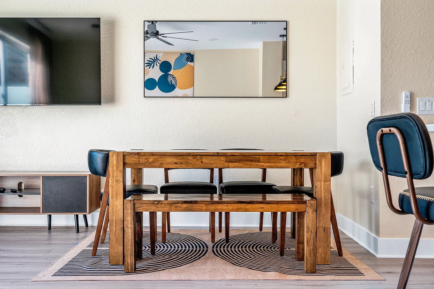 Warm dining space with a wood table set, modern mirror, and clean contemporary styling.