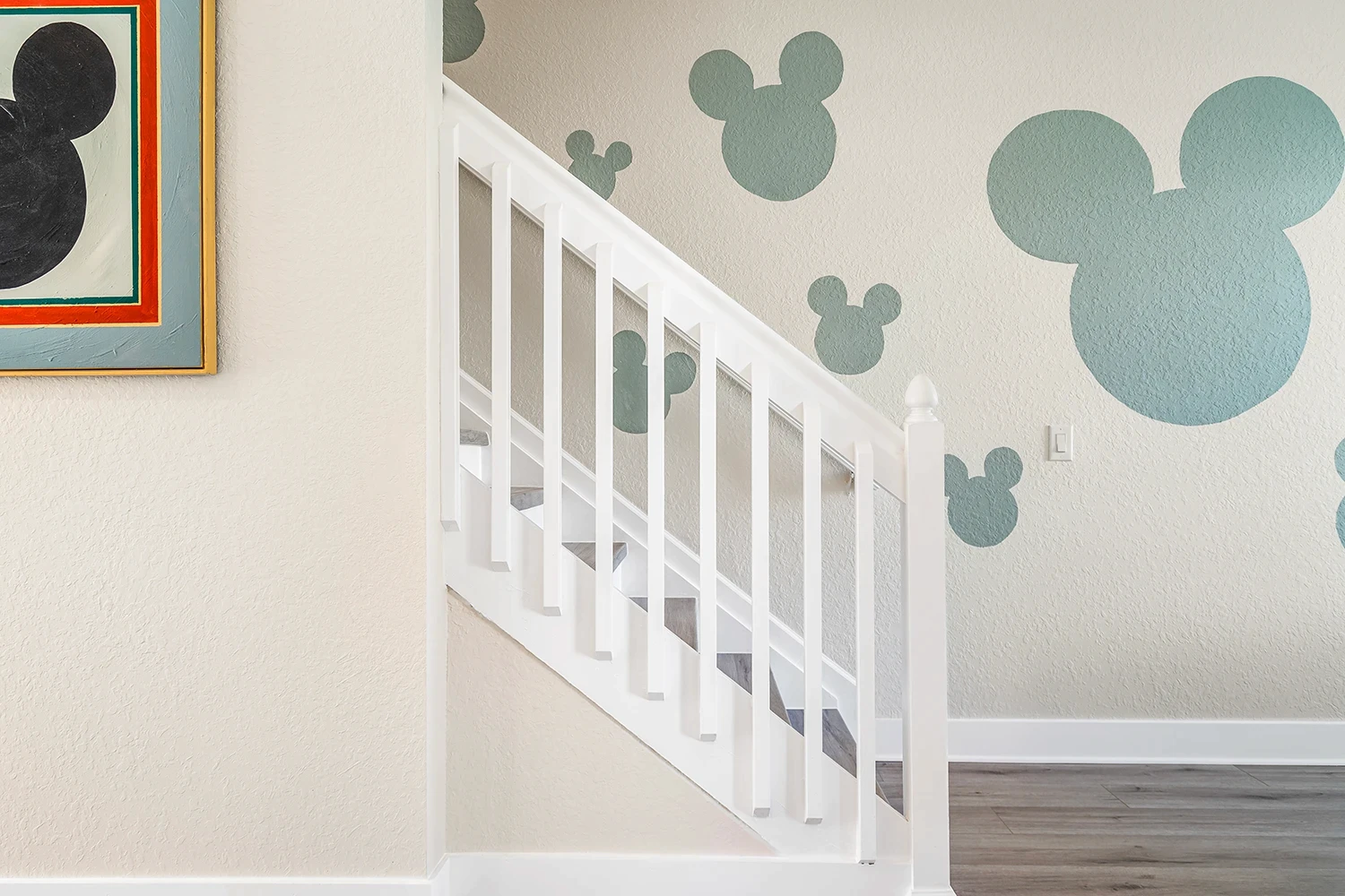 A playful transition space with subtle Mickey wall art and clean white staircase details.