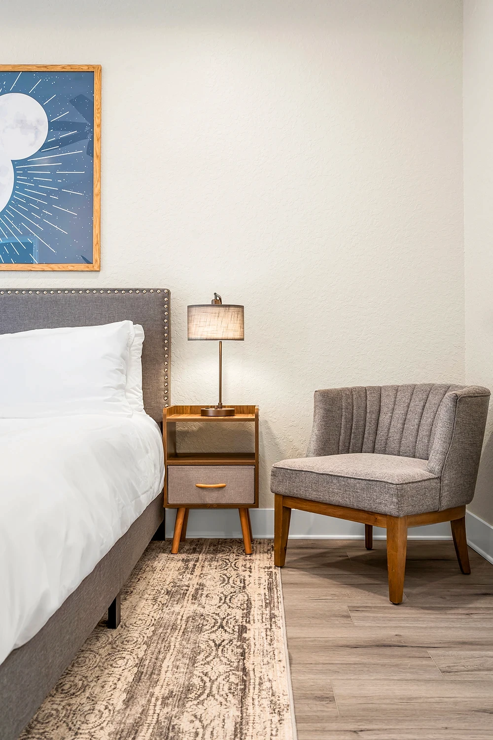 Bedroom detail highlighting warm textures, soft seating, and clean design accents.